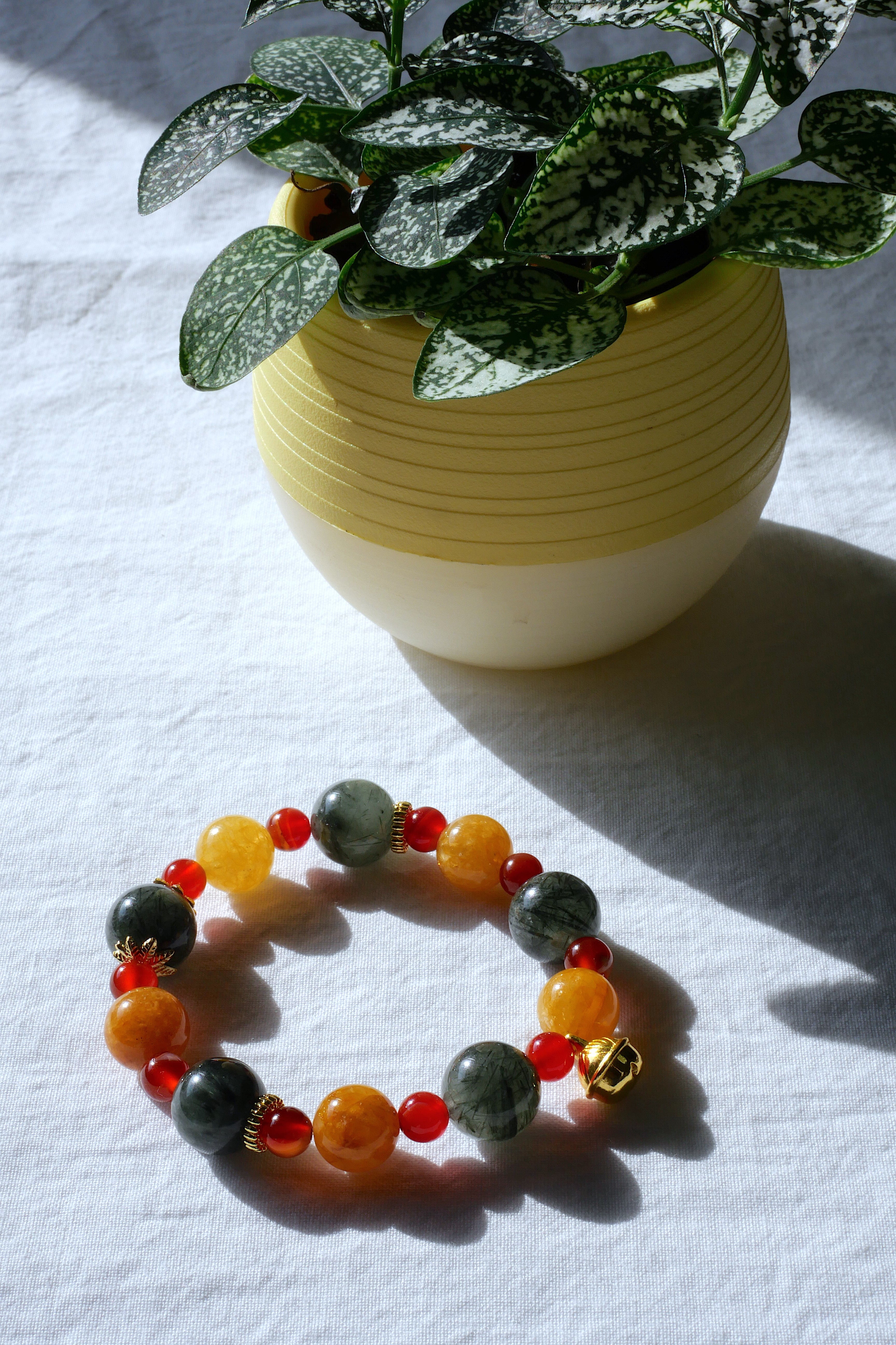 イエロージェルフラワーは柔らかな光のように優しく、レッドアゲートは祝祭の喜びと熱意を添えます。