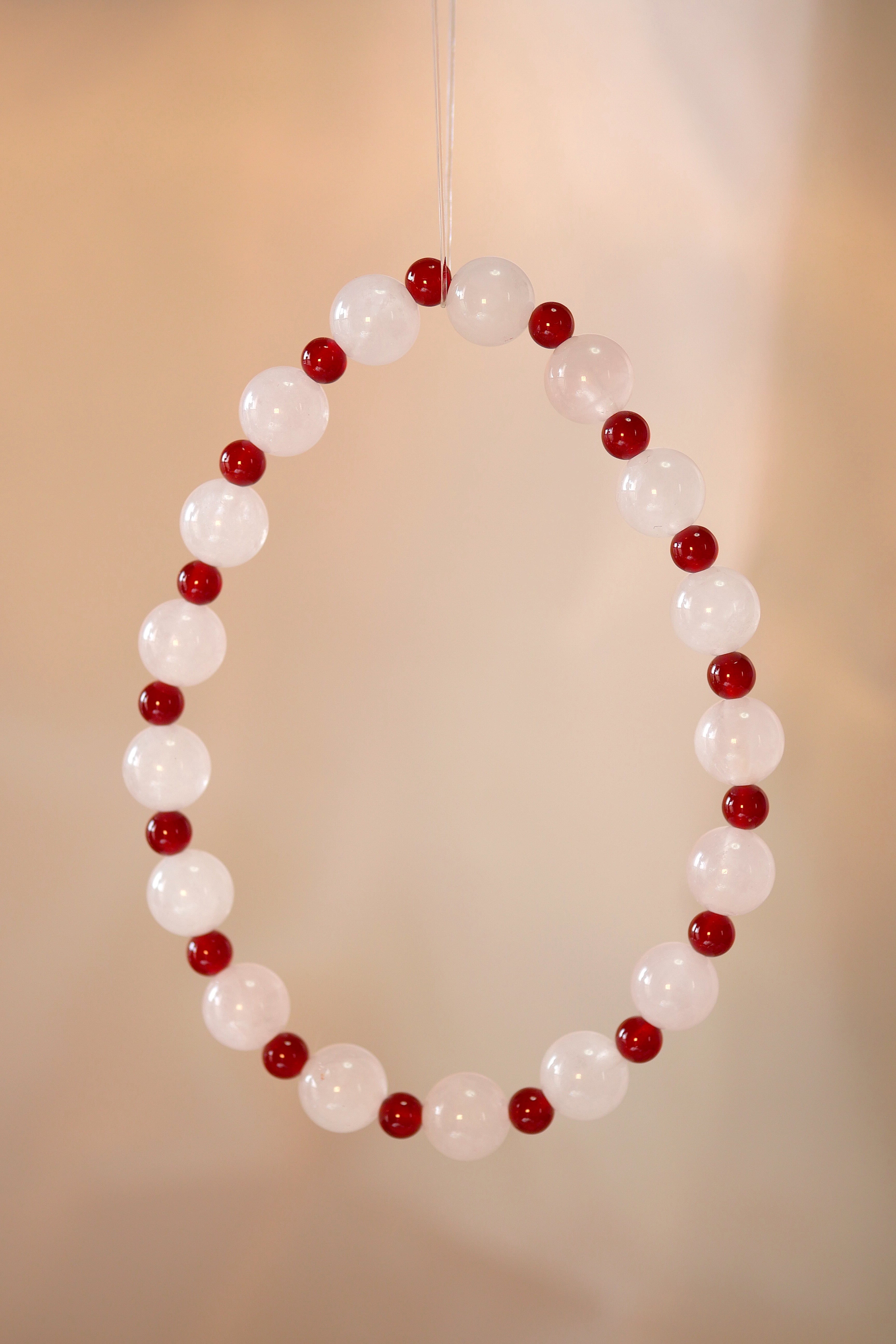 淡いピンク色の粉水晶と、深みのある赤の**紅瑪瑙(べにめのう)**を組み合わせた手串です。