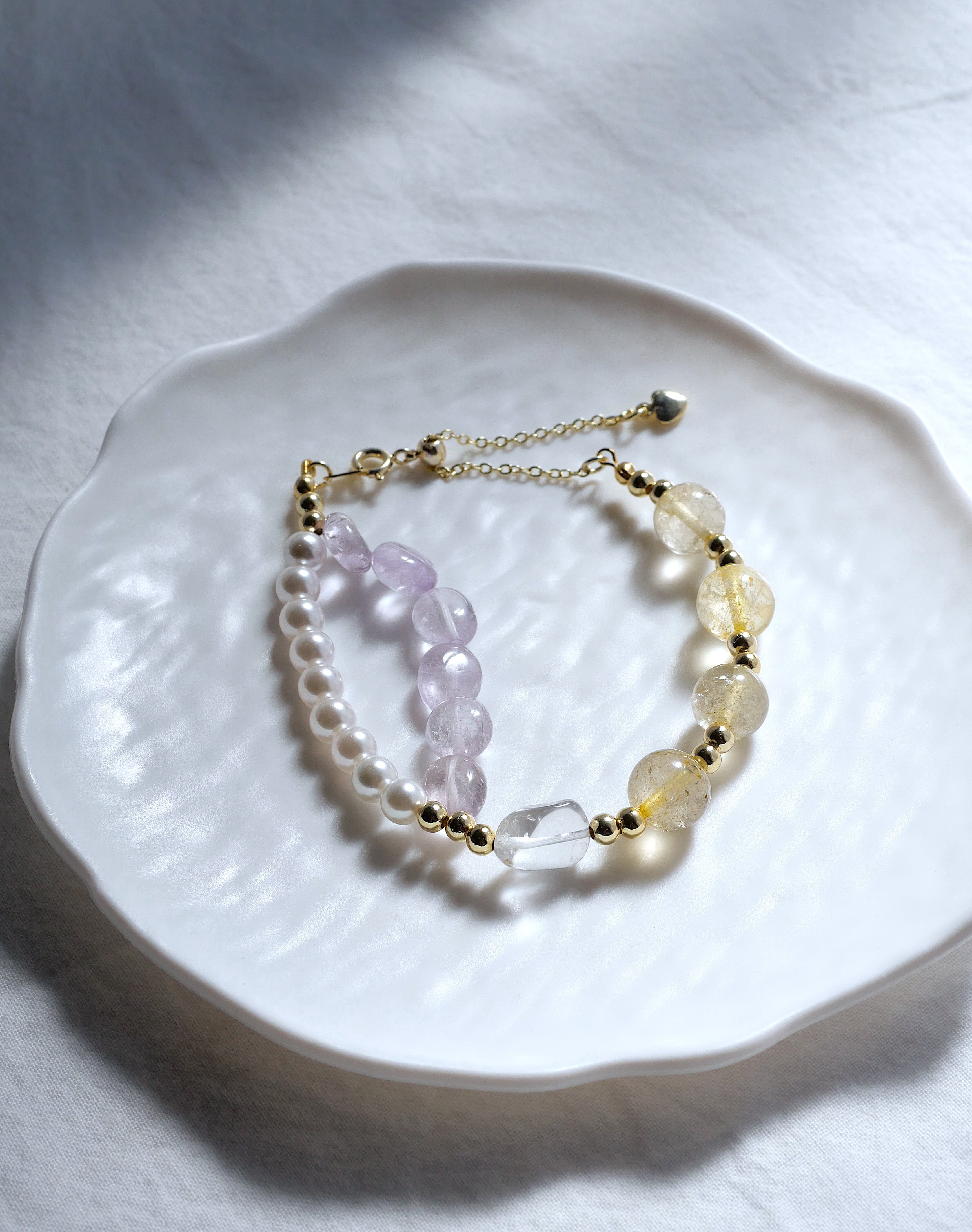 月のしずく — やわらかな月の光を思わせる淡い紫とゴールド、パールの輝きが手元に静かな美しさを添える