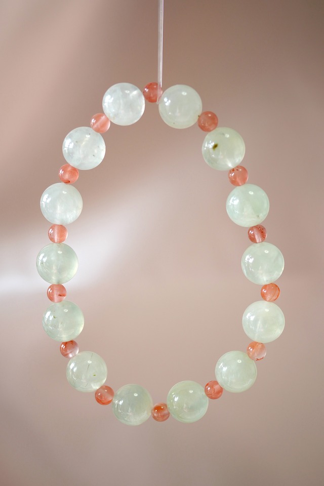 ★ 商品紹介(Product Description) やわらかな若草色の葡萄石に、 あたたかな朱色の南紅を添えました。 透明感のある優しい色合いが、 心にそっと春を呼び込むブレスレットです。 **「春雫」**は、 新しい始まりや、前向きな気持ちに寄り添います。 ★ 素材 (Materials) ● 葡萄石(プレナイト)10mm ● 南紅瑪瑙(なんこうめのう)5mm ★ デザインの寓意 (Meaning & Symbolism) 葡萄石(プレナイト) やさしい黄緑色が特徴の天然石。 心を落ち着かせ、穏やかな流れへと導く石として親しまれています。 直感や感情をやわらかく整える存在です。 南紅瑪瑙(なんこうめのう) 温もりを感じる赤色が美しい天然石。 生命力や前向きなエネルギーの象徴とされ、 内側から元気を与えてくれます。 春雫は、 強く踏み出すためのアクセサリーではなく、 やさしく背中を押してくれる存在。 迷いや不安があるときも、 小さな一歩を信じられるように。 静かに、確かに、 心に芽吹く光を大切にするためのブレスレットです。 ★ 注意事项 (ご利用前にお読みください) ● ハンドメイド製品のため、天然素材特有の色味・模様・サイズに個体差がございます。 これらは天然素材の魅力としてお楽しみください。 ● 水や汗に長時間触れると、木材部分の変色や劣化の原因となる場合がございます。 手洗いや入浴、運動の際は外していただくことをおすすめします。 ● 強い衝撃を与えると、天然石や木材が欠けたり割れたりする可能性があります。 お取り扱いにはご注意ください。 ● 日光に長時間当てると、色あせや変色を引き起こすことがあります。 保管の際は、高温多湿や直射日光を避けてください。 ● お子様やペットの手の届かない場所に保管してください。 ● 万が一、着用中に肌にかゆみ・赤み・かぶれなどの異常が現れた場合は、直ちに使用を中止し、医師の診察を受けてください。 ● ゴム紐を使用しているため、時間の経過とともに伸びやすくなります。 早めの交換をおすすめします.