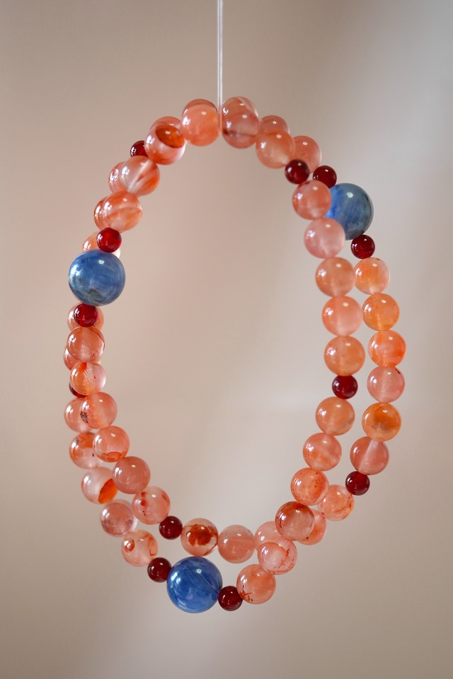 ★ 商品紹介(Product Description) 透明感のあるブルーが美しい**藍晶石(カイヤナイト)と、 深みのある赤色の赤瑪瑙(レッドアゲート)**を 組み合わせたブレスレットです。 藍晶石のやわらかな色合いの中に、 赤瑪瑙を等間隔で配し、 全体にリズムと表情を加えています。 シンプルな丸玉デザインで、 日常の装いにも自然になじみ、 季節を問わずお使いいただけます。 アジャスター付きのため、 手首に合わせてサイズ調整が可能です。 ★ 素材 (Materials) ● 藍晶石(カイヤナイト)8mm ● 赤瑪瑙(レッドアゲート)4mm ★ デザインの寓意 (Meaning & Symbolism) 青と赤、 対照的な色が並ぶことで生まれる、穏やかな調和。 静かな印象の中に、 ほんの少しの彩りを添えることで、 その日の装いや気分にさりげなく寄り添います。 主張しすぎず、 けれど記憶に残る存在として。 日常の一部になるアクセサリーを目指しました。 ★ 注意事项 (ご利用前にお読みください) ● ハンドメイド製品のため、天然素材特有の色味・模様・サイズに個体差がございます。 これらは天然素材の魅力としてお楽しみください。 ● 水や汗に長時間触れると、木材部分の変色や劣化の原因となる場合がございます。 手洗いや入浴、運動の際は外していただくことをおすすめします。 ● 強い衝撃を与えると、天然石や木材が欠けたり割れたりする可能性があります。 お取り扱いにはご注意ください。 ● 日光に長時間当てると、色あせや変色を引き起こすことがあります。 保管の際は、高温多湿や直射日光を避けてください。 ● お子様やペットの手の届かない場所に保管してください。 ● 万が一、着用中に肌にかゆみ・赤み・かぶれなどの異常が現れた場合は、直ちに使用を中止し、医師の診察を受けてください。 ● ゴム紐を使用しているため、時間の経過とともに伸びやすくなります。 早めの交換をおすすめします.