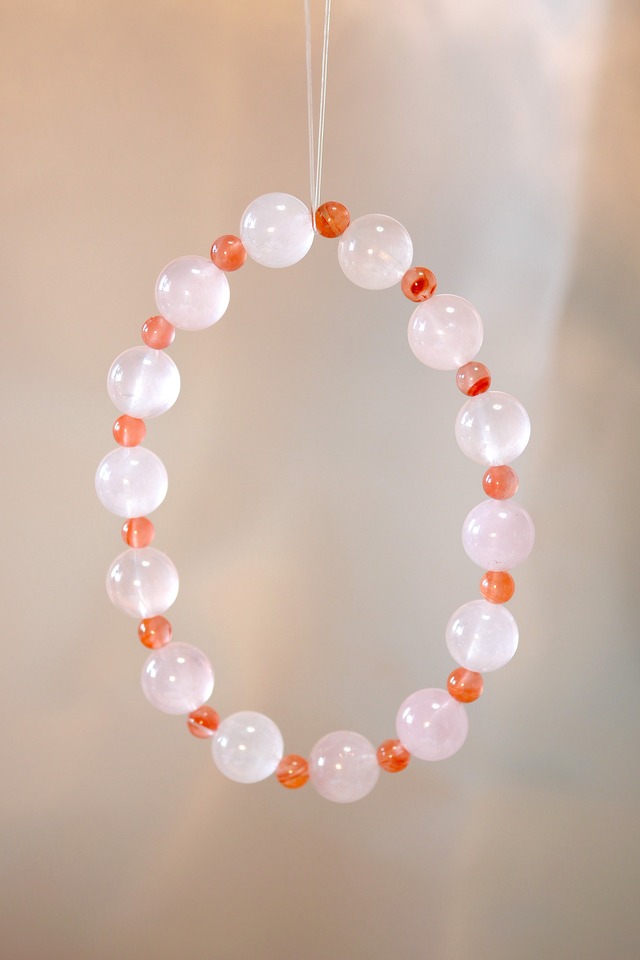 ★ 商品紹介(Product Description) やわらかな色合いの マダガスカル産ピンククォーツを主役に、 南紅のあたたかみある色を アクセントとして組み合わせたブレスレットです。 大粒のピンククォーツが 透明感のある穏やかな印象を与え、 間に配した南紅が 全体にやさしいリズムと奥行きを添えています。 主張しすぎない配色のため、 季節や装いを選ばず、 日常使いしやすいデザインに仕立てました。 ★ デザインの寓意 (Meaning & Symbolism) 強く輝く光ではなく、 朝の空や窓辺に差し込む 淡く静かな光をイメージしています。 マダガスカル産ピンククォーツの やわらかな質感は、 気持ちをふっと緩めるような印象を。 南紅の自然な色合いは、 日常の中にある ささやかな温度や安心感を表しています。 身につける人の一日が、 少しだけやさしく、 少しだけ穏やかになることを願った一点です。 ★ 素材 (Materials) ● マダガスカル産 ピンククォーツ 10mm ● 南紅瑪瑙(なんこうめのう)4.5mm~5mm ★ 注意事项 (ご利用前にお読みください) ● ハンドメイド製品のため、天然素材特有の色味・模様・サイズに個体差がございます。 これらは天然素材の魅力としてお楽しみください。 ● 水や汗に長時間触れると、木材部分の変色や劣化の原因となる場合がございます。 手洗いや入浴、運動の際は外していただくことをおすすめします。 ● 強い衝撃を与えると、天然石や木材が欠けたり割れたりする可能性があります。 お取り扱いにはご注意ください。 日光に長時間当てると、色あせや変色を引き起こすことがあります。 保管の際は、高温多湿や直射日光を避けてください。 ● お子様やペットの手の届かない場所に保管してください。 ● 万が一、着用中に肌にかゆみ・赤み・かぶれなどの異常が現れた場合は、直ちに使用を中止し、医師の診察を受けてください。 ● ゴム紐を使用しているため、時間の経過とともに伸びやすくなります。 早めの交換をおすすめします.